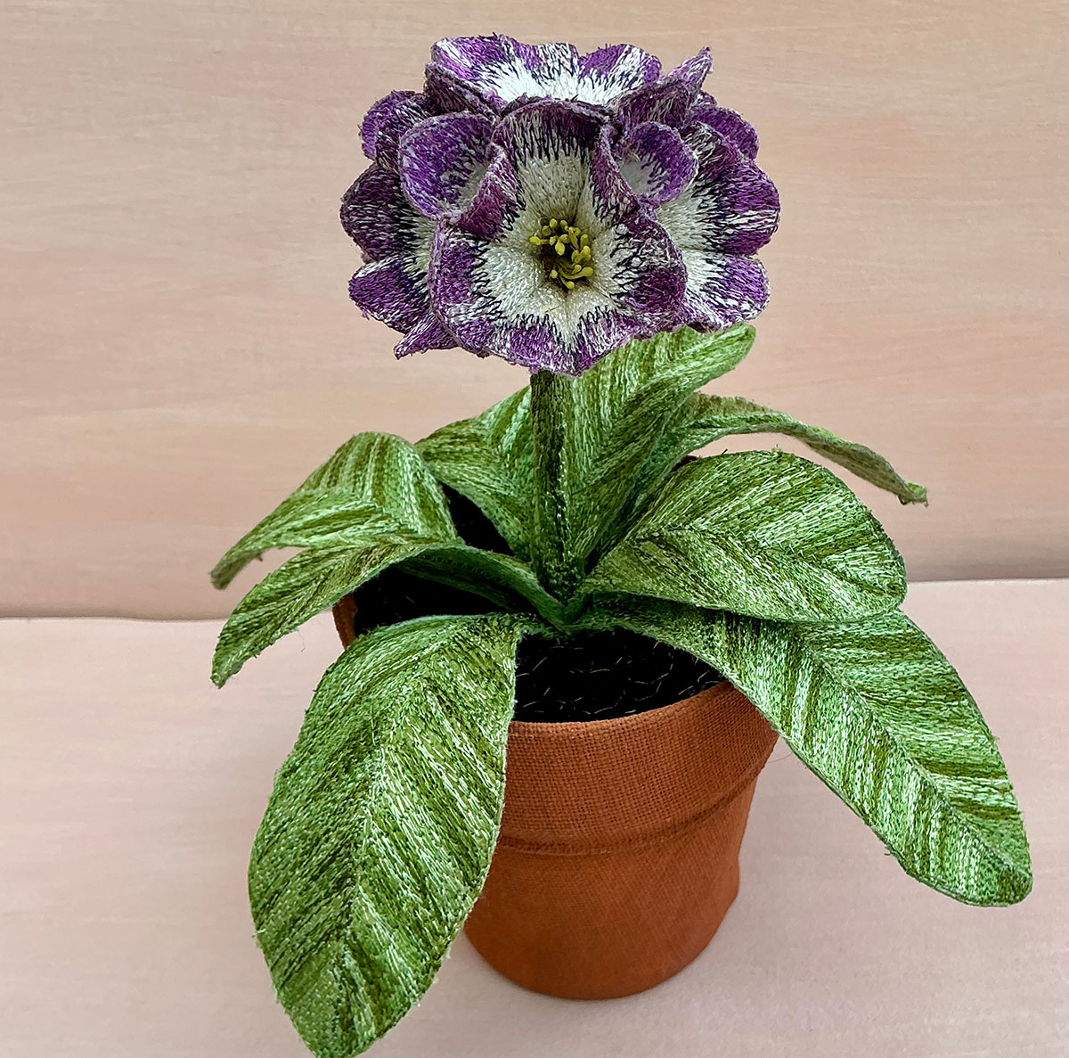 3D Auricula ‘pot plant’ textile sculpture constructed using machine and hand embroidery. Even the ‘soil’ is made from embroidered velvet, and the pot is also covered in fabric. A beautiful decorative ornament, these Auriculas flower for very much longer than their botanical counterparts! They are approximately 20cm high.