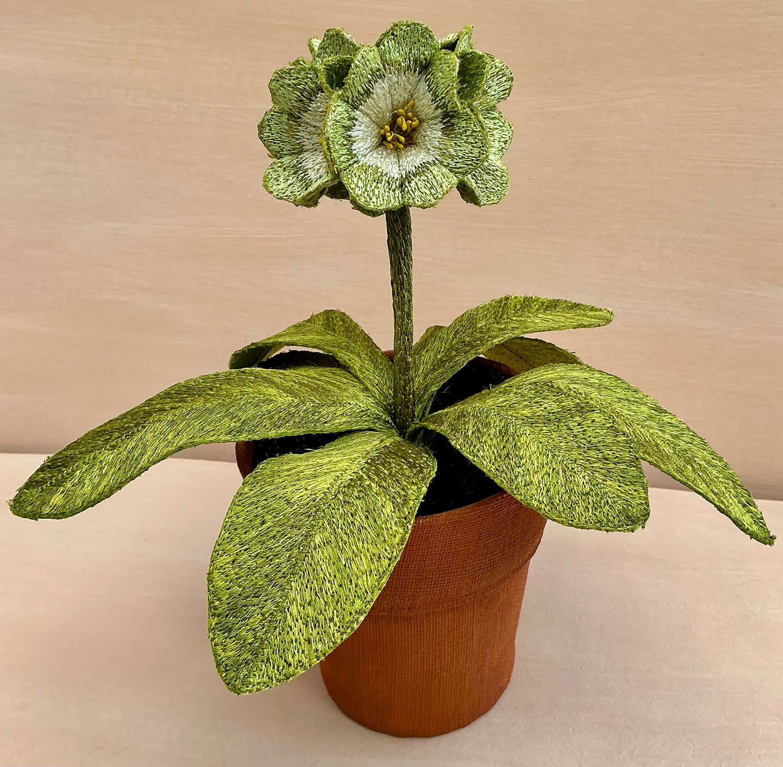 This three-dimensional Auricula sculpture is machine and hand embroidered on to a background of handmade linen paper. It is wired and stiffened, and are housed in fabric-covered ‘terracotta’ pot with embroidered velvet soil. It is perfect for displaying on a shelf or under a glass dome.